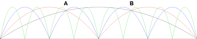 Hier sind die Stromkurven für 4 Bänder mit ihren Beträgen dargestellt. Wie man sieht, gibt es außer den Enden zwei Punkte, an denen sich alle 4 Kurven schneiden. Das bedeutet, dass in diesen Punkten für alle Bänder gleiche Widerstandsverhältnisse herrschen.