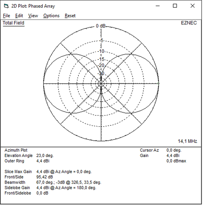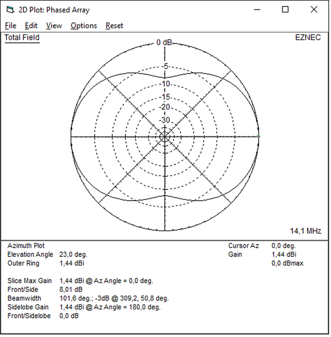Um einen Eindruck vom Unterschied zwischen dem Freiraumdiagramm und der Charakteristik mit Bodenrelexionen zu vermitteln, habe ich auch mit Ground Type 'Real/High Accuracy' simuliert.