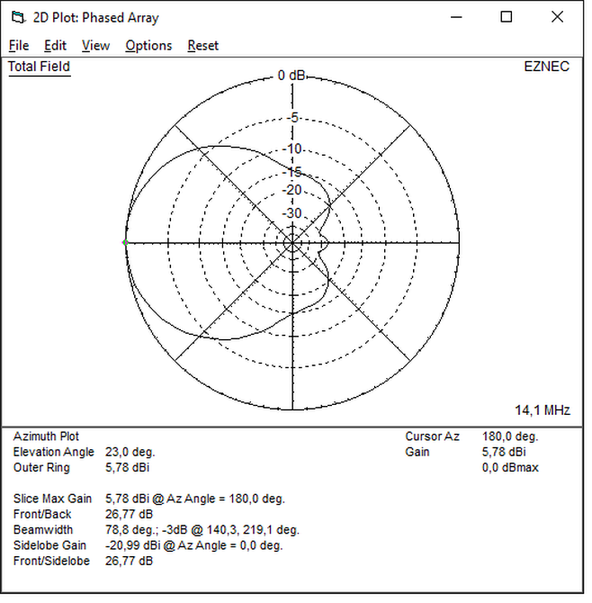 Die Elemente sind 6,4m lang, der Elementabstand beträgt 3,0m, die Aufbauhöhe ist 10m. Als Ground Type wurde Free Space gewählt.