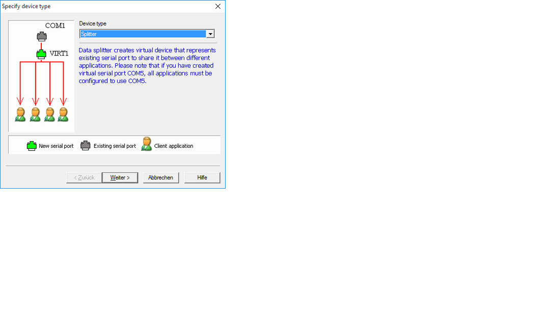 Ich habe VSPE installiert und aus den verschiedenen Möglichkeiten Virtual Splitter gewählt.